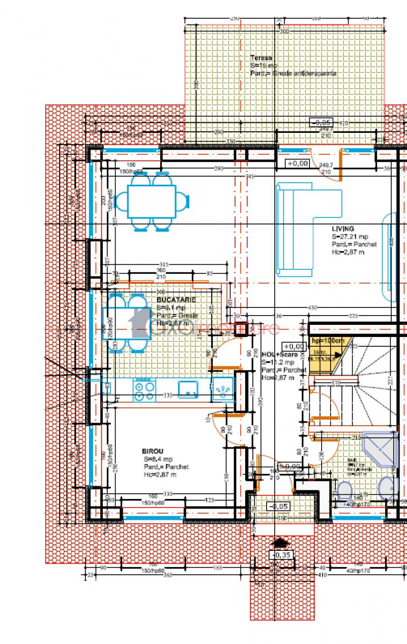 PARTER / PRIMUL NIVEL: 1 living cu dining, 1 bucatarie, 1 birou, 1 hol, 1 baie, casa scarii, 1 terasa.