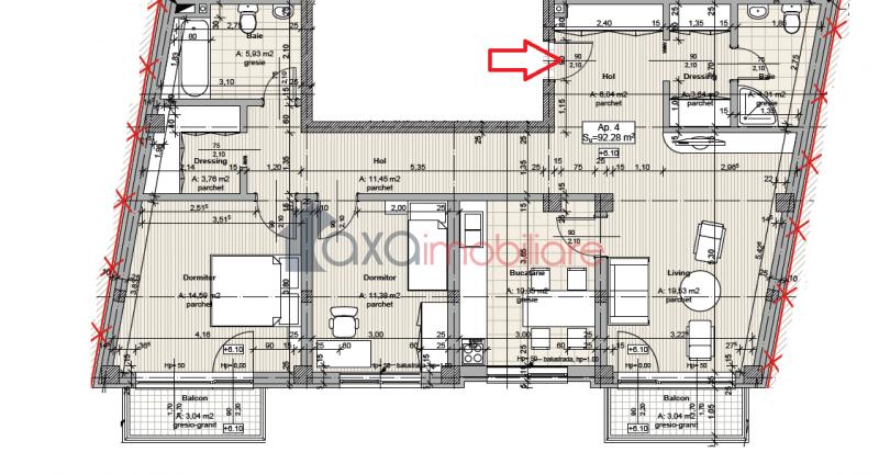 Compartimentare: 1 living, 1 bucatarie, 2 holuri, 2 dormitoare, 2 dressing-uri, 2 bai si 2 balcoane.