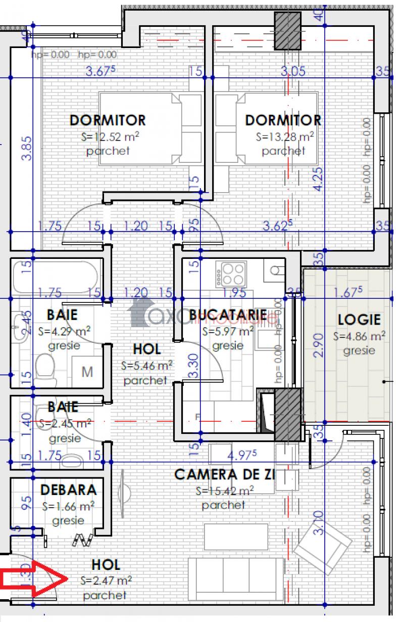 Imobilul este compus dintr-un living, 2 holuri, 2 dormitoare, 2 bai, 1 bucatarie, 1 debara si 1 logie.