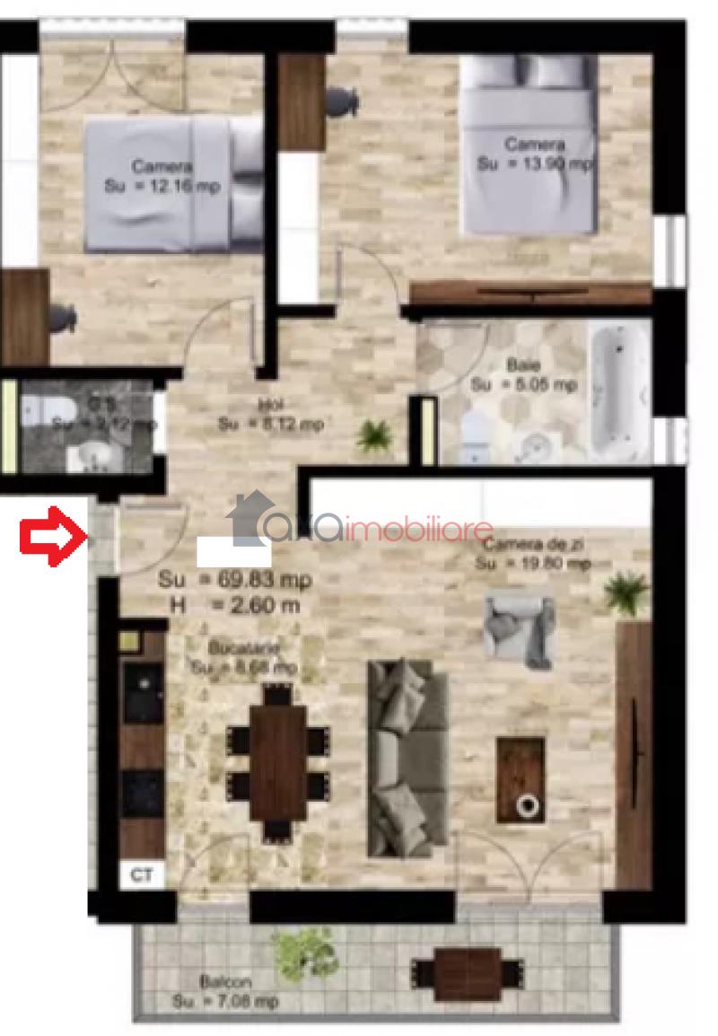 Compartimentare: 1 camera de zi (19.80 mp), 1 bucatarie (8.68 mp), 1 dormitor (13.90 mp), 1 dormitor (12.16 mp), 1 baie (5.05 mp), 1 grup sanitar (2.12. mp), 1 hol (8.12 mp).
