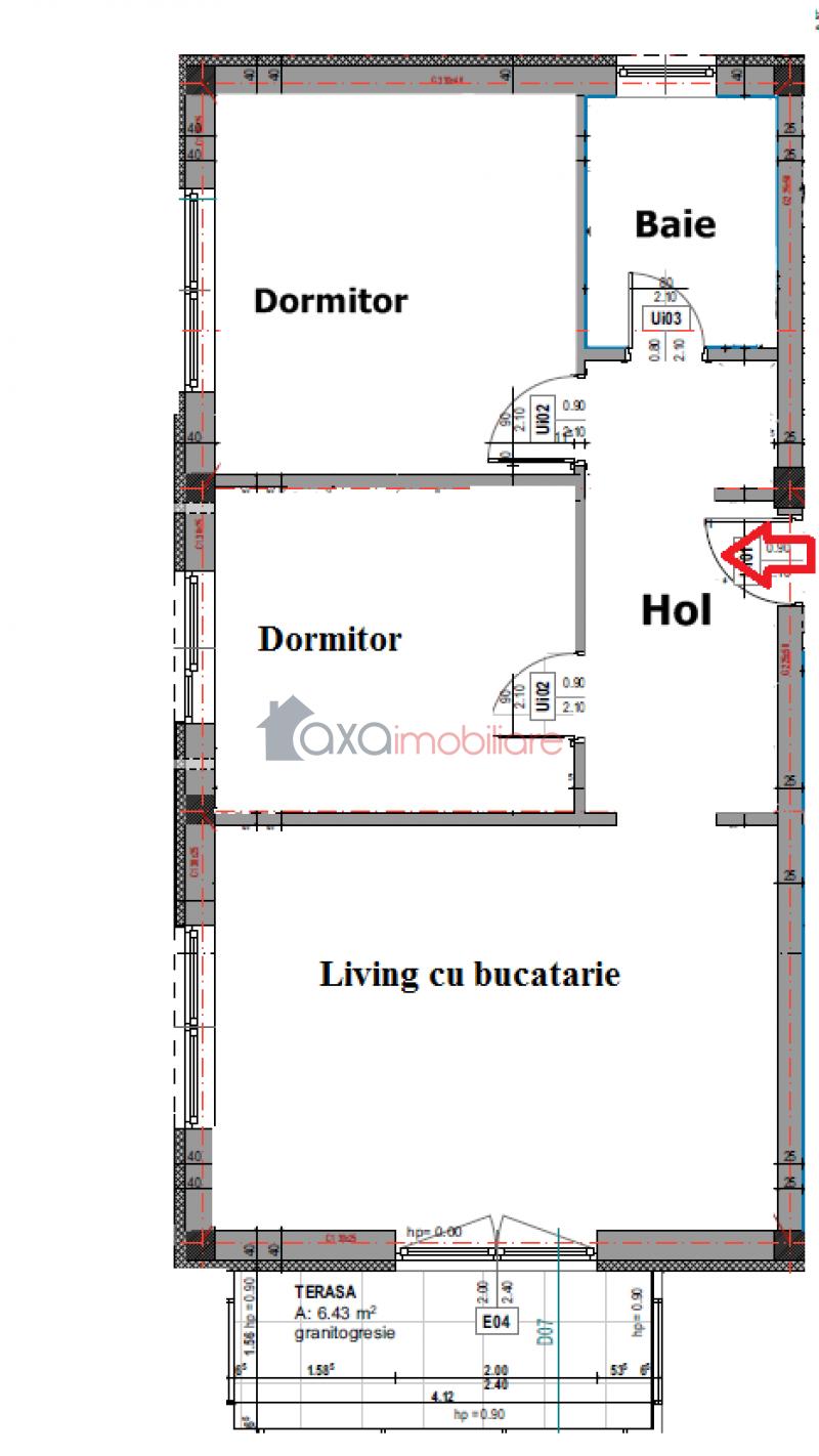 Compartimentare: 1 hol, 1 living cu 1 bucatarie de tip open space, 2 dormitoare, 1 baie si 1 terasa.