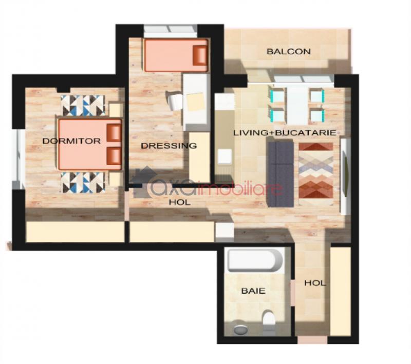 Compartimentare: 2 holuri, 1 living cu bucatarie open space cu iesire pe balcon, 2 dormitoare, 1 baie.