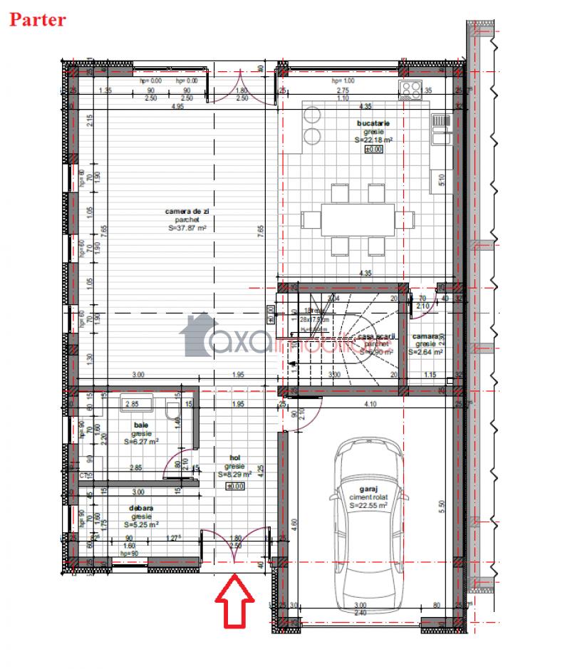 - Primul nivel: 1 hol, 1 camera de zi, 1 bucatarie, 1 debara, 1 baie, 1 camara, 1 garaj.