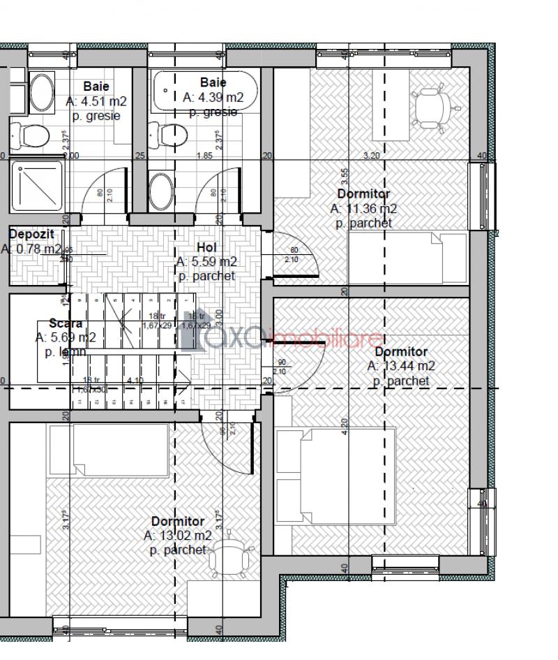ETAJ: Dormitor 1 (11.36 mp), dormitor 2 (13.44 mp), dormitor 3 (13.02 mp), hol (5.59 mp), spatiu depozitare (0.78 mp), baie 1 (4.39 mp), baie 2 (4.51 mp), casa scarii (5.69).
